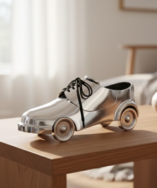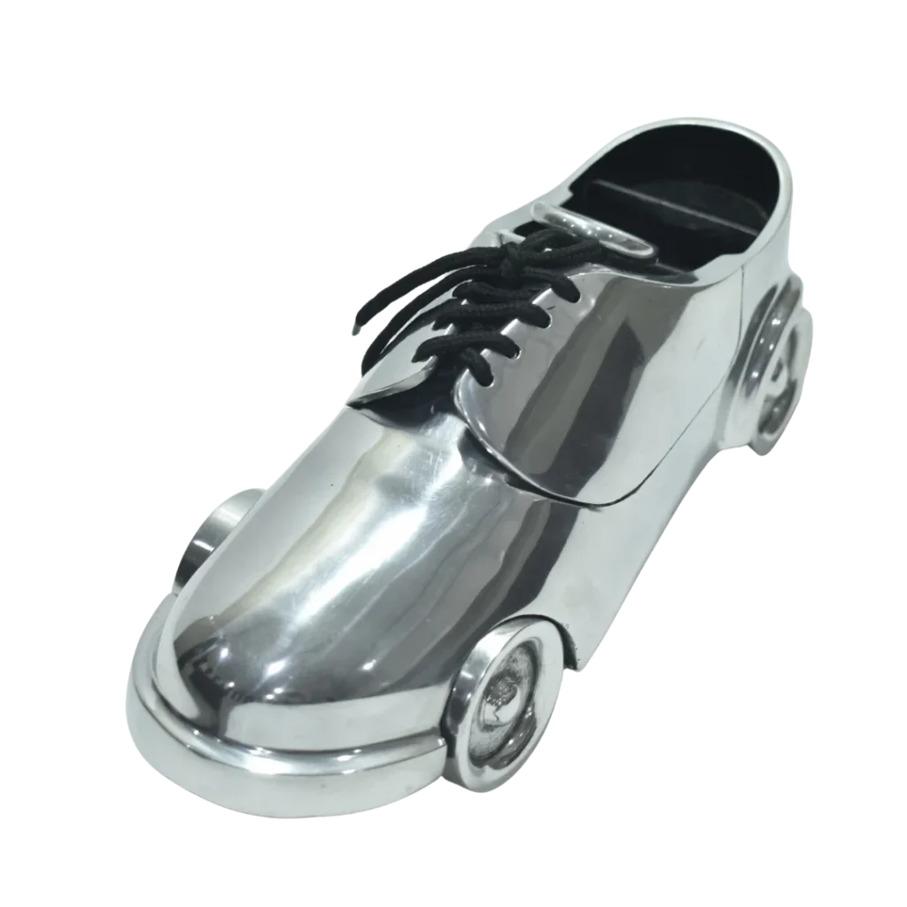 This metallic shoe car showpiece is a premium decorative accessory for car lovers and collectors. Made from high quality metal with mirror polished finish, it features a unique shoe shaped body with smooth wheels. Ideal for car dashboards, office desks, shelves, and display counters. We manufacture this product with precision, durability, and fine craftsmanship to deliver long lasting shine and elegant appeal. Perfect as a stylish décor item or gift.