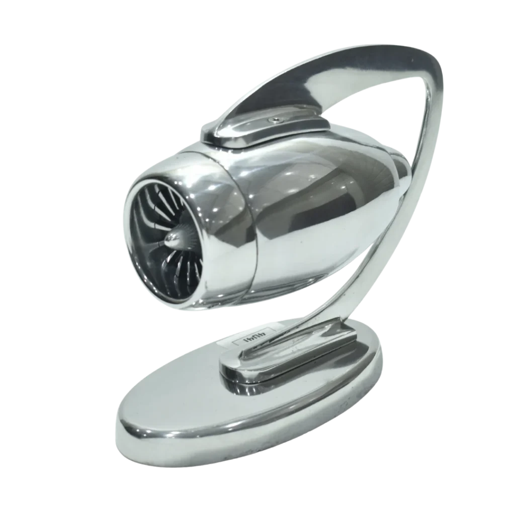 This metallic jet engine showpiece is a modern décor accent designed for premium interiors. Manufactured from solid metal with a high gloss chrome finish, it delivers a sleek aerospace inspired look. Perfect for office desks, reception areas, shelves, and display units. Our craftsmanship ensures strong construction, smooth edges, and lasting shine. An excellent choice for corporate gifting, collectors, and anyone seeking distinctive, high quality decorative products for modern lifestyle spaces worldwide appeal and elegance today now.