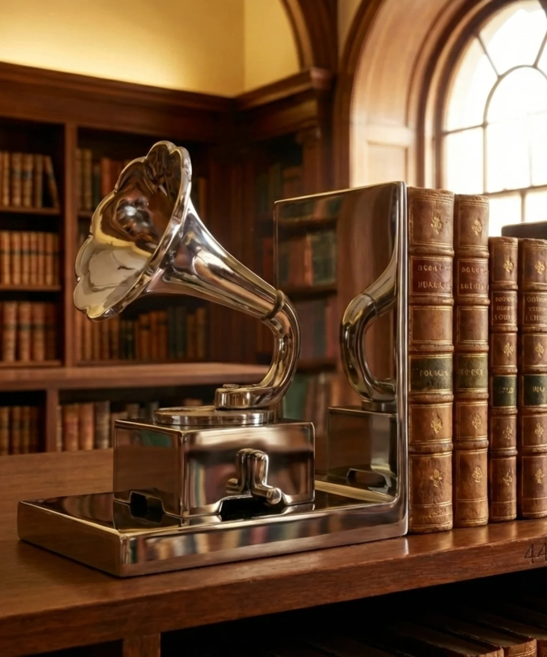 Blending vintage inspiration with refined metal craftsmanship, these gramophone style bookends bring a timeless charm to any bookshelf. The polished finish and detailed base create a striking contrast against classic hardbound books, making them both functional and decorative. Designed for stability and long term use, they keep your collection neatly supported while adding character to study rooms, libraries, or office spaces. A distinctive accent piece for those who appreciate heritage style with a modern touch.